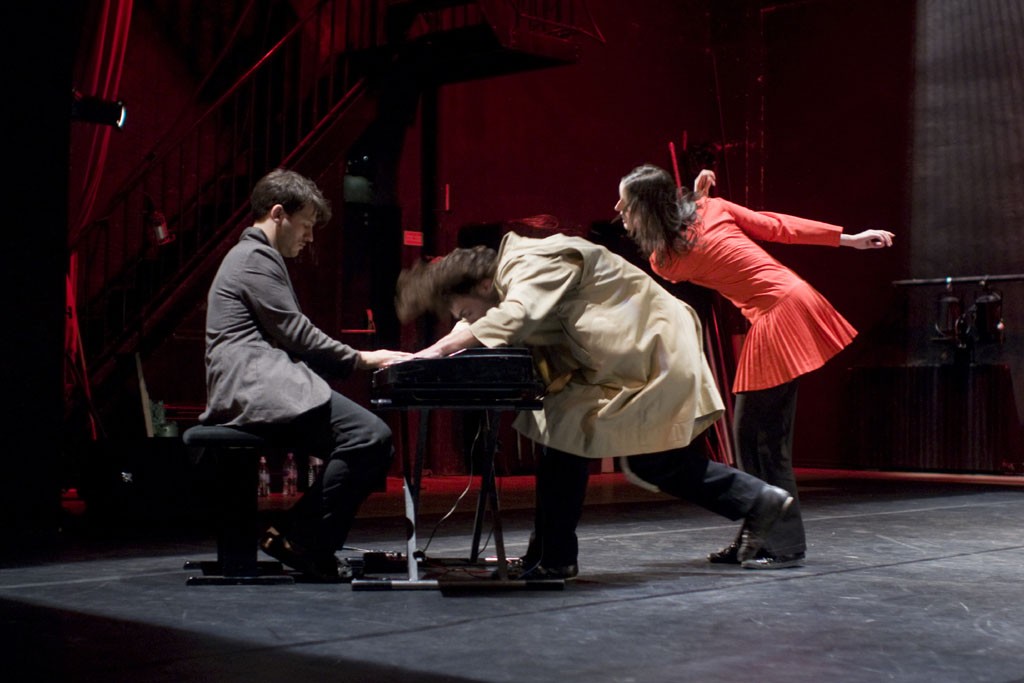 L’essentiel repose sur l’action des acteurs danseurs et l’improvisation est une part importante des répétitions. Je travaille avec leur personnalité pour faire sortir ce qu’ils sont: ils doivent chercher la vérité de leur être. De leur engagement total dans le mouvement, émerge une dramaturgie très physique. Je me sers de ce qu’ils me donnent, de ce qui leur échappe: mon travail est de mettre en forme ce qui arrive ou qui n’arrive pas, musicaliser les faits. L’histoire est un support originelle, pour fertiliser l’imaginaire des danseurs… une histoire que le public ne connaîtra pas. (Brigitte Fischer)